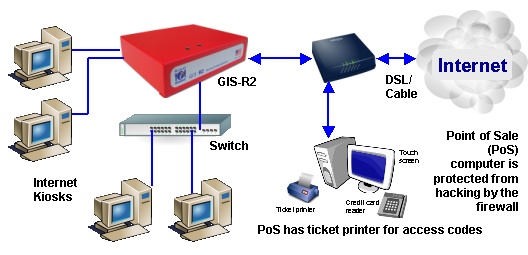 An Internet café can also add a point of sale terminal (PoS) and configure it to fetch codes from the GIS-R2 so that customers can pay at the checkout and receive a code from the ticket printer.