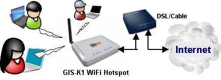 The GIS-K1 Wi-Fi Hotspot is installed in the business premises as shown in the diagram below: