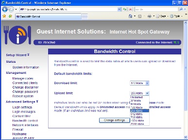 The GIS-R2 hotspot gateway allows overall download and upload speeds to be set and optionally different speeds can be set for individual users.